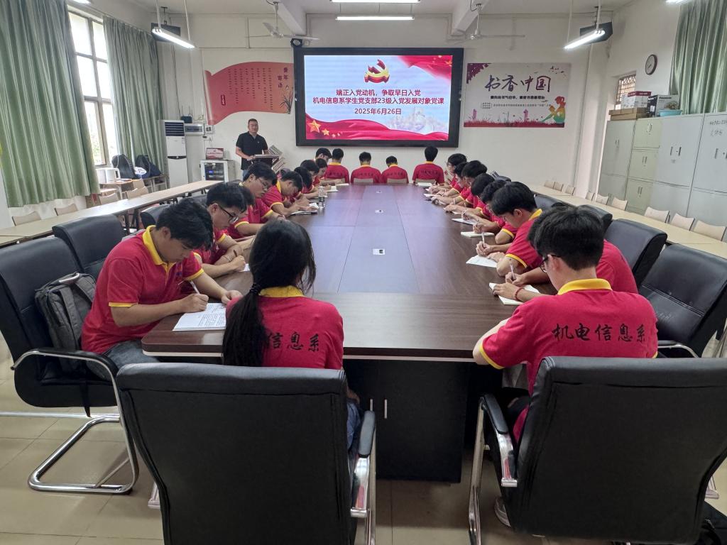 为推动学习贯彻习近平新时代中国特色社会主义思想主题教育走深走实,学思明悟党的二十届三中全会精神,进一步筑牢入党发展对象的理想信念根基,严把发展学生党员的“入口关”“质量关”,6月26日,机电信息系学生党支部在机电大楼党员活动中心举办2023级入党发展对象专题党课《端正入党动机,争取早日入党》。党课由学生党支部书记张汉军开讲,全体入党发展对象参加学习。