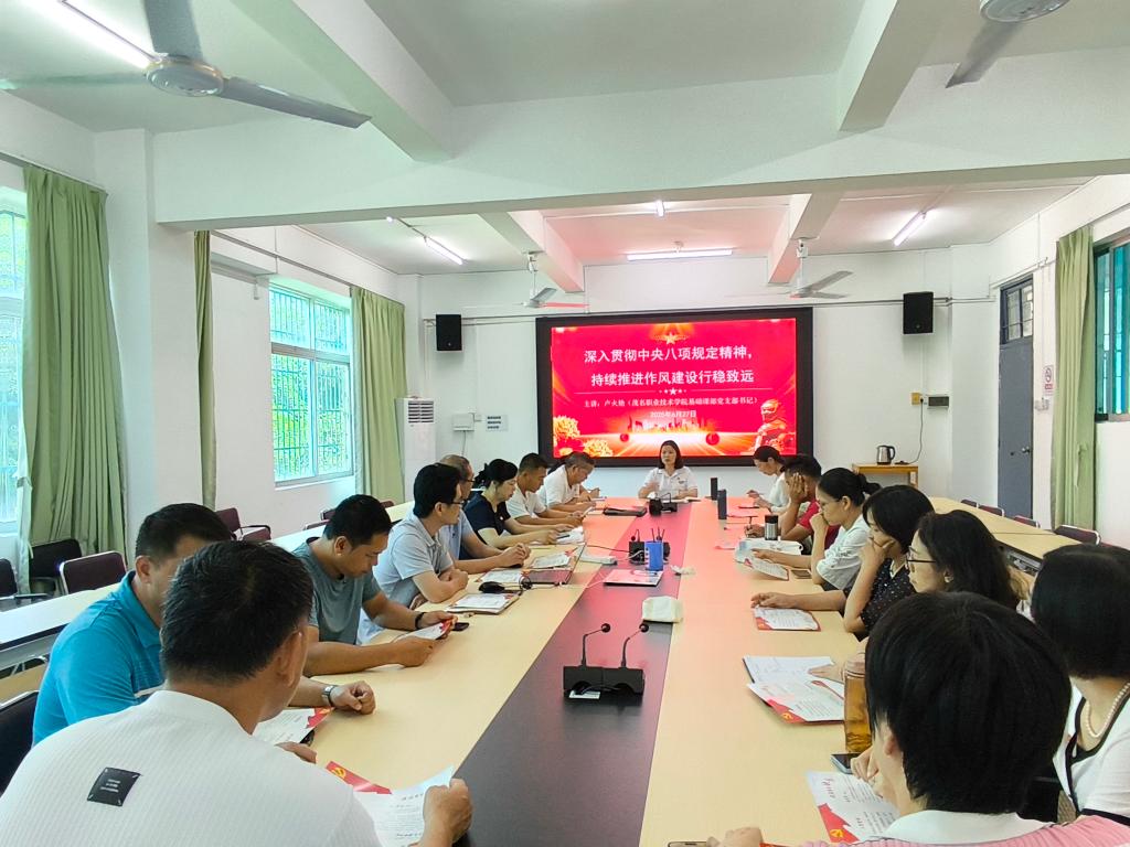 为庆祝中国共产党成立104周年,深入贯彻落实中央八项规定精神,基础课部党支部积极响应学校号召,于6月27日在北校区1号教学楼202室举行迎“七一”系列活动暨中央八项规定精神学习教育主题党日活动,活动由党支部书记卢火艳主持,全体党员参加。