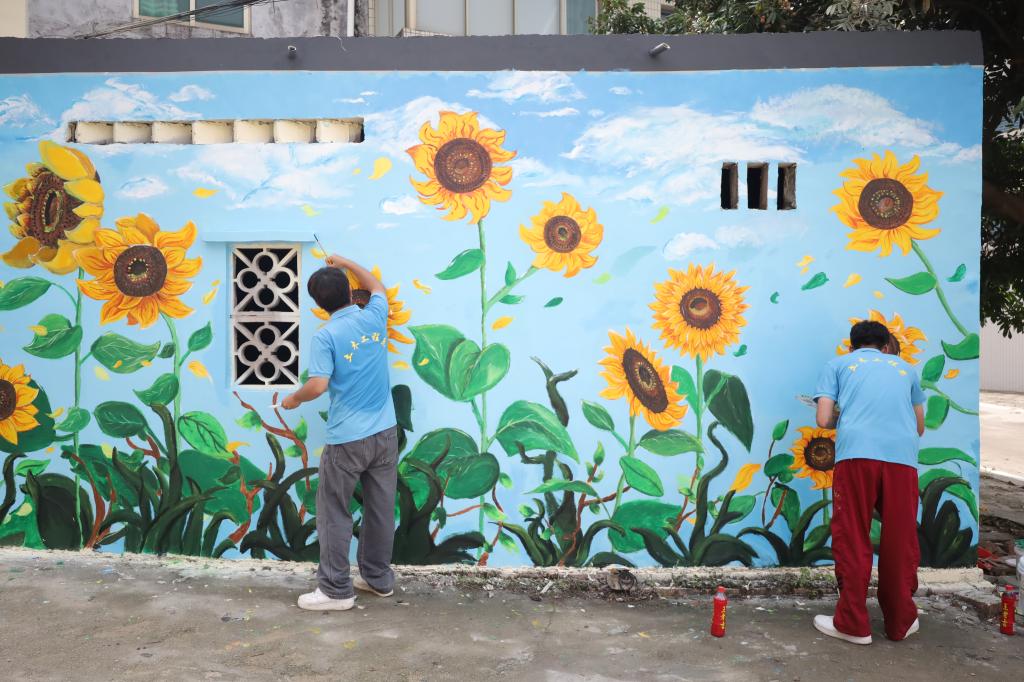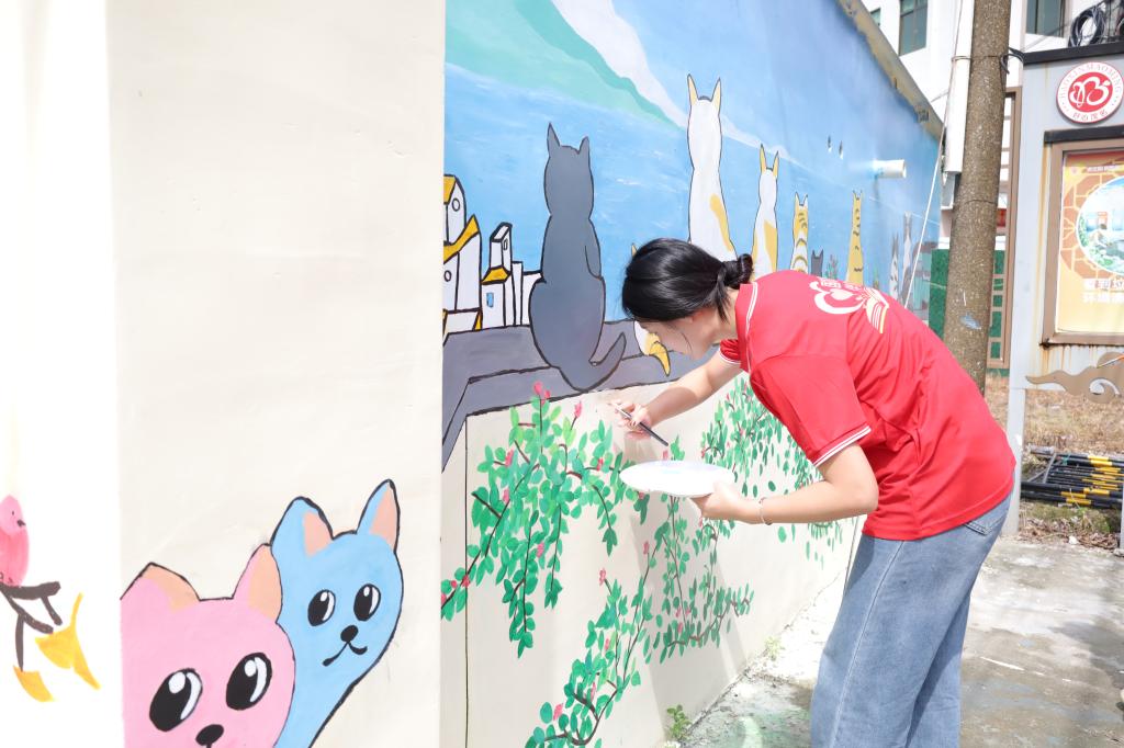 人居环境美化改造方面,土木工程系建筑设计、建筑室内设计等专业的同学们充分发挥自身专业优势,对后湾村的人居环境进行了实地勘察与评估,以该村的新村、新业、新貌为基调,结合当地的地理环境和村民实际需求,在该社区进行了“彩绘乡村”人居环境美化改造,用鲜艳的色彩和生动的画面,将乡村的美好愿景呈现在墙上。尽管天气炎热,汗水多次浸湿了同学们的衣衫,但他们依然全神贯注,一丝不苟。经过几天的努力,一幅幅精美的墙绘作品呈现在村民眼前。这些墙绘不仅美化了社区环境,更传递了积极向上的正能量,让村民们感受到了乡村的新变化和新活力,也为墨胶社区增添了一道亮丽的风景线。