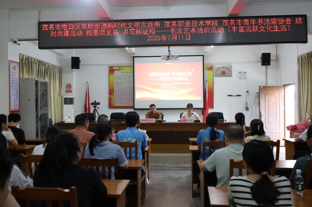 为促进乡村文化建设,实践队主动联系茂名市电白区高地街道办、茂名市青年书法协会等组织,联合举办了书法艺术培训活动。活动在茂名市电白区高地街道办会议室举行,活动现场气氛热烈,充满了浓厚的文化气息,吸引了众多书法爱好者和村民积极参与。广东省硬笔书法协会副主席、茂名市青年书法家协会主席、茂名市书法家协会副主席林雄伟先生以《与书法交个朋友》为题,从书法的历史渊源、艺术价值以及学习书法的意义等方面展开讲解。他用生动有趣的方式,将复杂的书法知识化繁为简,让在场的村民对书法有了更深入的了解。本次活动还穿插了现场互动、现场挥毫、现场赠墨等丰富多彩的互动环节,使村民们的视野得到了较大拓宽,激发了村民们参与乡村文化建设的积极性和主动性,赢得了村民们热烈的掌声和广泛的赞誉。