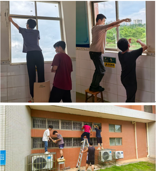 在系领导统一组织下,大家高效完成了门窗加固、室内外卫生清理等任务,并对教学楼外围易受损区域进行了多轮细致排查,以实际行动诠释责任担当,确保防护工作全覆盖、无死角。