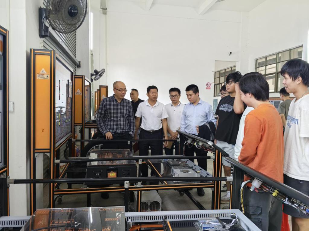 座谈结束后,龙志军一行参观了我校汽车专业实训中心。与现场指导教师就“设备运行维护与课程教学结合”“学生实践能力评价体系”等问题展开互动交流。期间,龙志军还结合新能源汽车电池实训设备,为在场学生开展了一场生动的实训指导课。他以动力电池系统为案例,详细拆解了电池模组的结构组成、充放电控制原理及常见故障诊断方法,并通过现场提问、操作演示等方式与学生积极互动,课堂氛围热烈。学生们表示,此次指导让他们对专业知识的实践应用有了更直观的理解,收获颇丰。