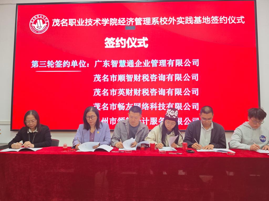 11月28日,茂名职业技术学院“产教融合筑平台,校企合作育人才”校外实践基地签约授牌仪式暨人才培养研讨会在数字电商产业学院顺利举办,为数智财经教研室的大数据与会计、财税大数据应用、大数据与财务管理三大核心专业建设积蓄了新动能。经济管理系领导、专业教师团队及茂名市代理记账协会27家会员企业代表,以签约授牌与深度交流为抓手,筑牢校企协同育人根基。