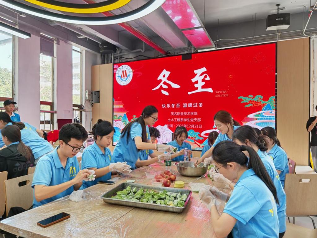 冬至阳生,岁回律转。12月21日,茂名职业技术学院土木工程系学生党支部以“快乐冬至 温暖过冬”为主题,开展冬至感恩系列活动。学生党支部师生党员、系团学、系青协携手包五彩水饺、制暖心汤圆,更将这份冬日暖意送到校园一线工作者手中,以实际行动传承传统文化、践行感恩初心。