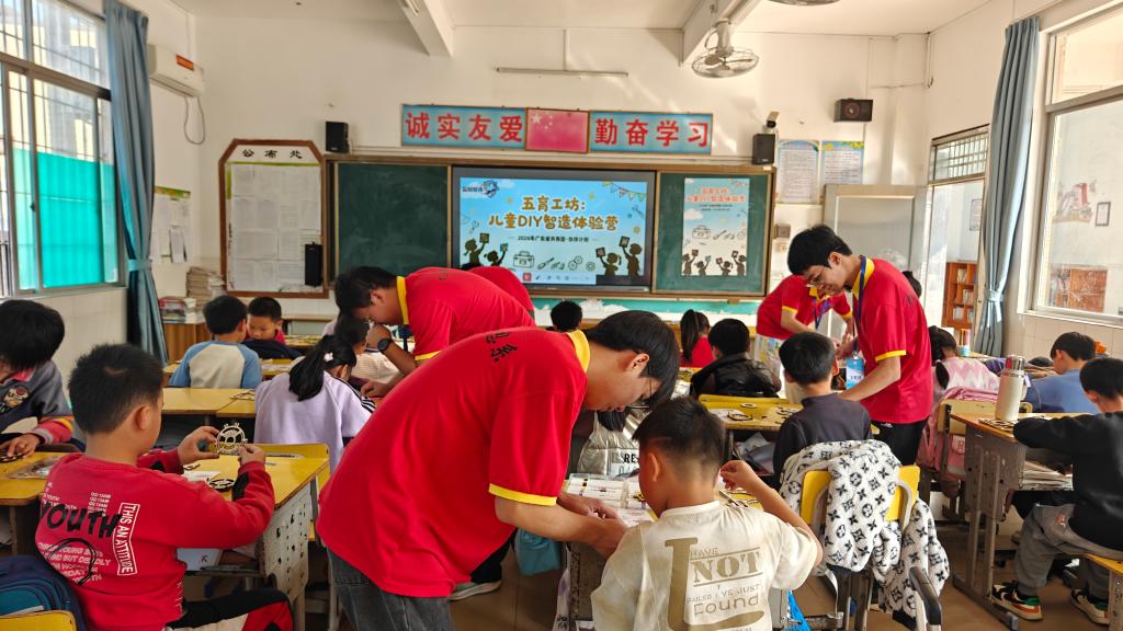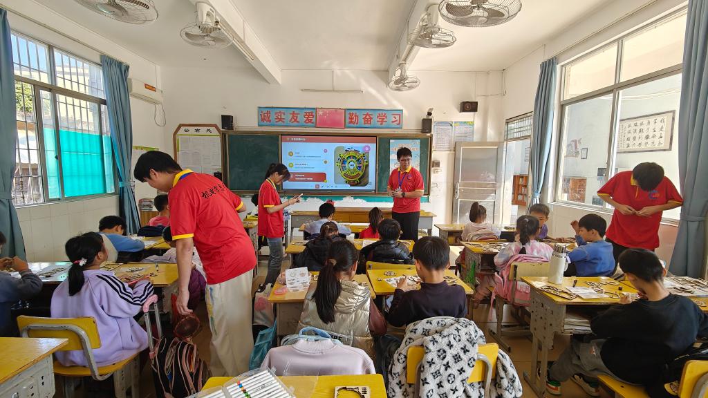 1月16日下午,茂名市电白区沙院镇五和小学三年级教室里,传来阵阵欢声笑语与细微的组装声。茂名职业技术学院机电信息系“智械暖青突击队”的大学生们,为孩子们带来了一堂别开生面的“五育工坊”实践课。活动以德智体美劳全面发展的育人理念为主线,巧妙地将物理学科中的机械原理与中华传统文化中的计时智慧—万年历巧妙融合,通过亲手制作木质齿轮万年历,在孩子们心中播下科学探索与文化自信的种子。