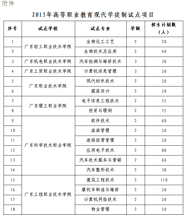 根据《教育部关于开展现代学徒制试点工作的意见》(教职成〔2014〕9号)、《广东省教育厅关于做好2015年高职院校招生培养改革试点申报工作的通知》(粤教高函〔2014〕208号)以及《广东省教育厅关于做好2015年高等职业院校自主招生试点工作的通知》(粤教考函〔2015〕9号)等文件精神,在院校申报的基础上,经研究,决定广东轻工职业技术学院生物化工工艺专业等19所院校的51个专业,在2015年开展高等职业教育现代学徒制试点(具体名单见附件)。现将有关事项通知如下: