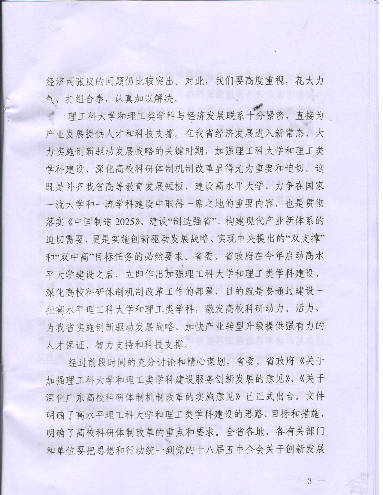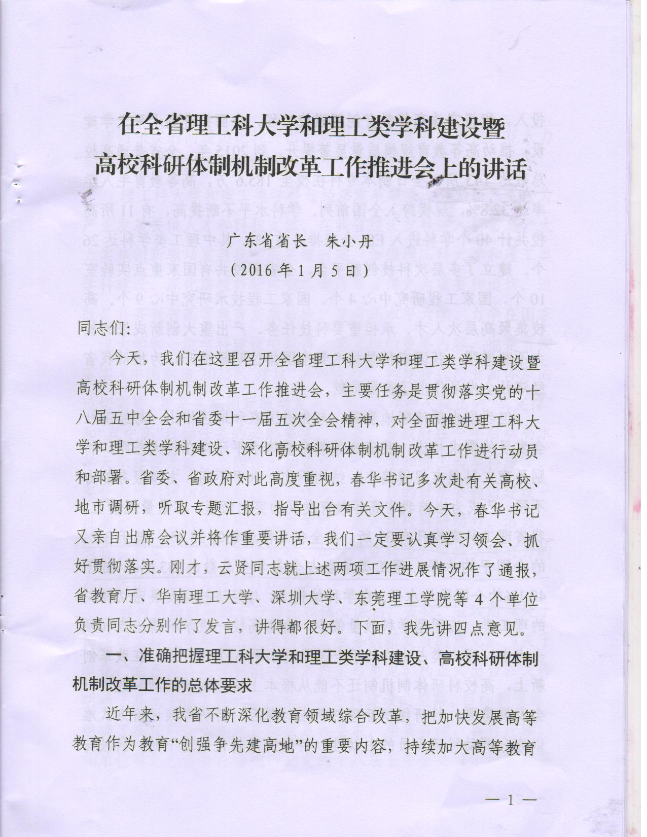 广东省省长朱小丹在全省理工科大学和理工类学科建设暨高校科研体制机制改革工作推进会上的讲话