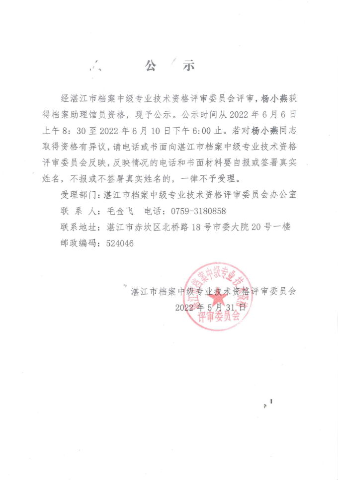 关于通过档案专业职称评审人员的公示