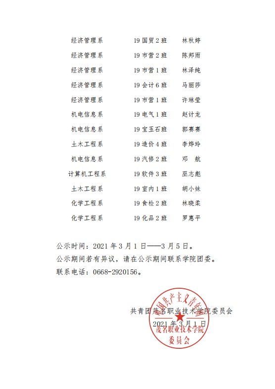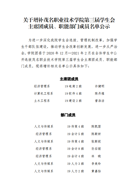 关于增补茂名职业技术学院第三届学生会主席团成员、职能部门成员名单公示