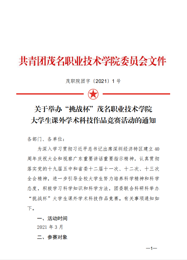 关于举办“挑战杯”茂名职业技术学院大学生课外学术科技作品竞赛活动的通知