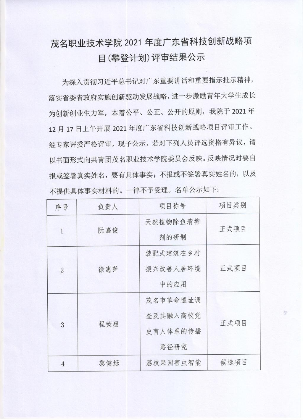 茂名职业技术学院2021年度广东省科技创新战略项目(攀登计划)评审结果公示