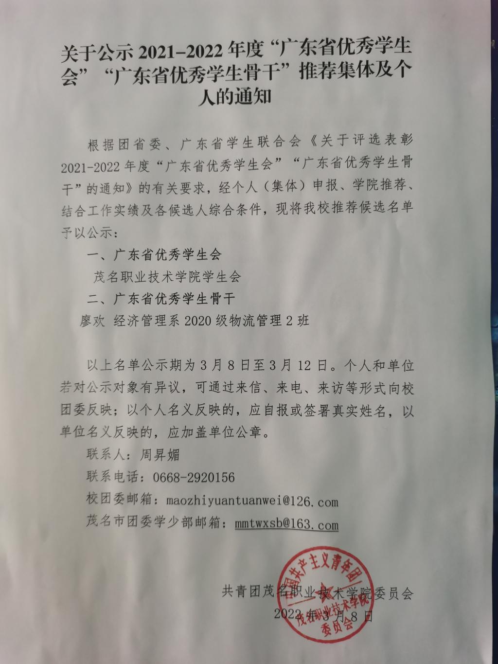 关于公示2021-2022年度“广东省优秀学生会”“广东省优秀学生骨干”推荐集体及个人的通知