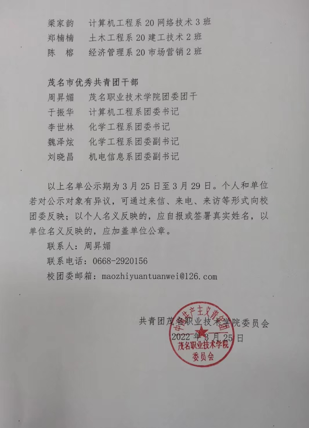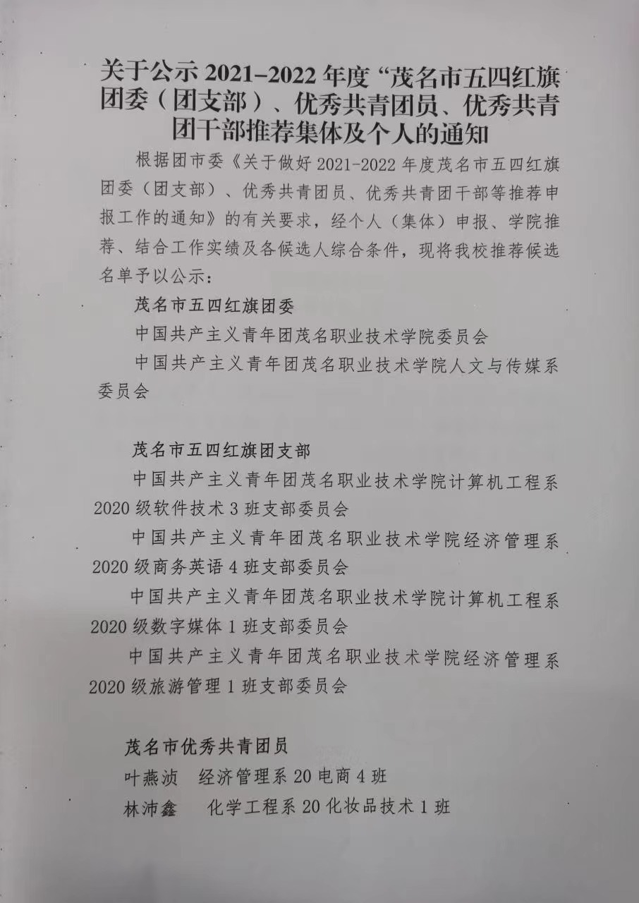 关于公示2021-2022年度“茂名市五四红旗团委(团干部)、优秀共青团员、优秀共青团干部”推荐集体及个人的通知