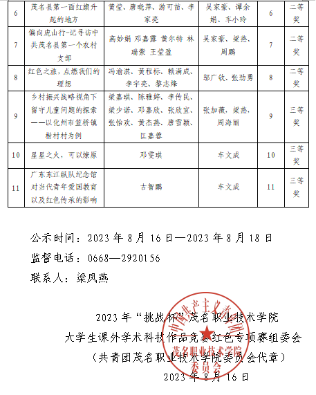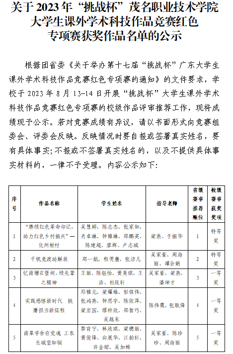 关于2023年“挑战杯”茂名职业技术学院大学生课外学术科技作品竞赛红色专项赛获奖作品名单的公示