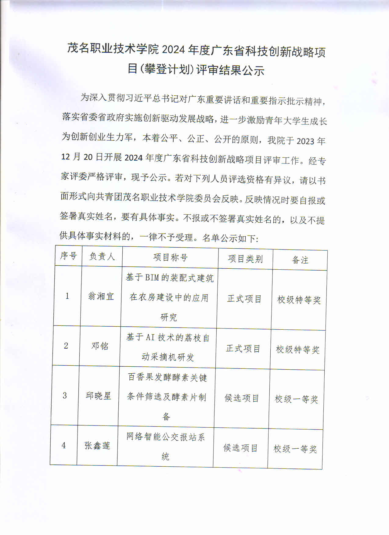 茂名职业技术学院2024年度广东省科技创新战略项目(攀登计划)评审结果公示