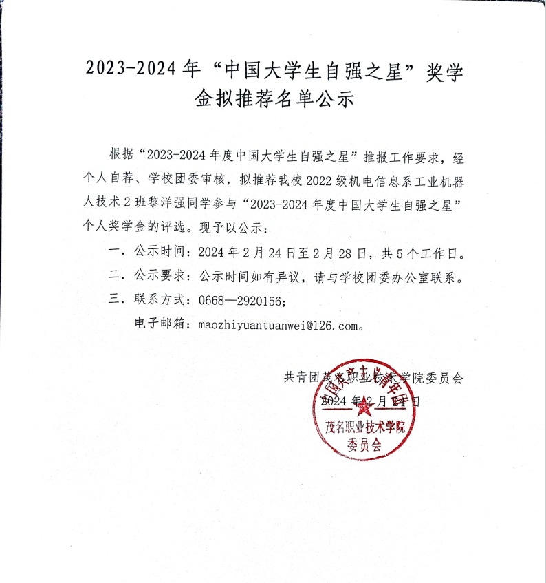 2023-2024年度“中国大学生自强之星”奖学金拟推荐名单公示