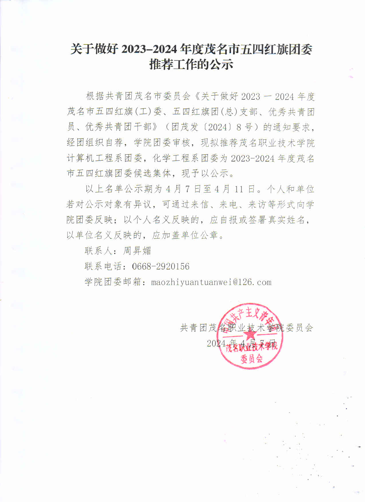 关于做好 2023-2024年度茂名市五四红旗团委推荐工作的公示
