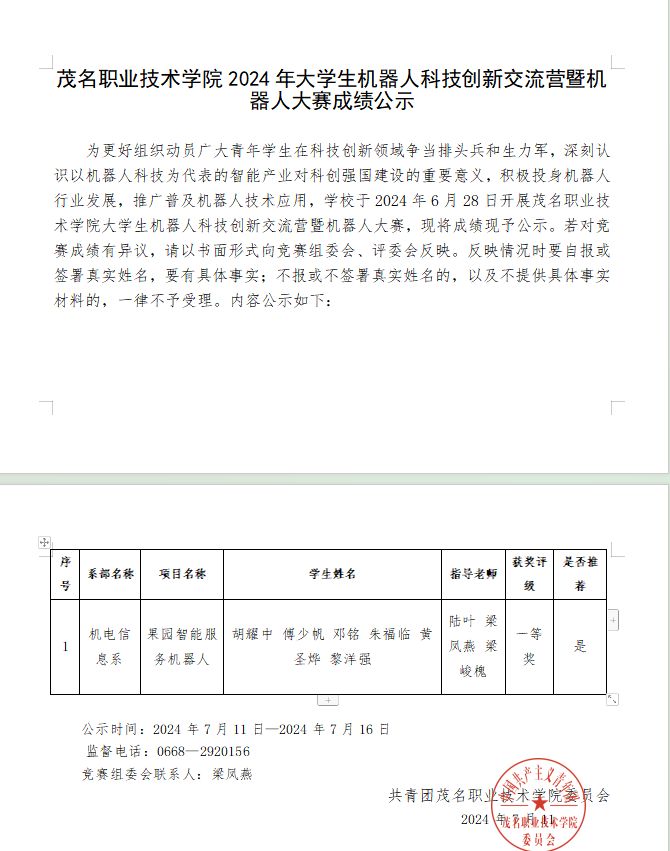茂名职业技术学院 2024 年大学生机器人科 技创新交流营暨机器人大赛成绩公示