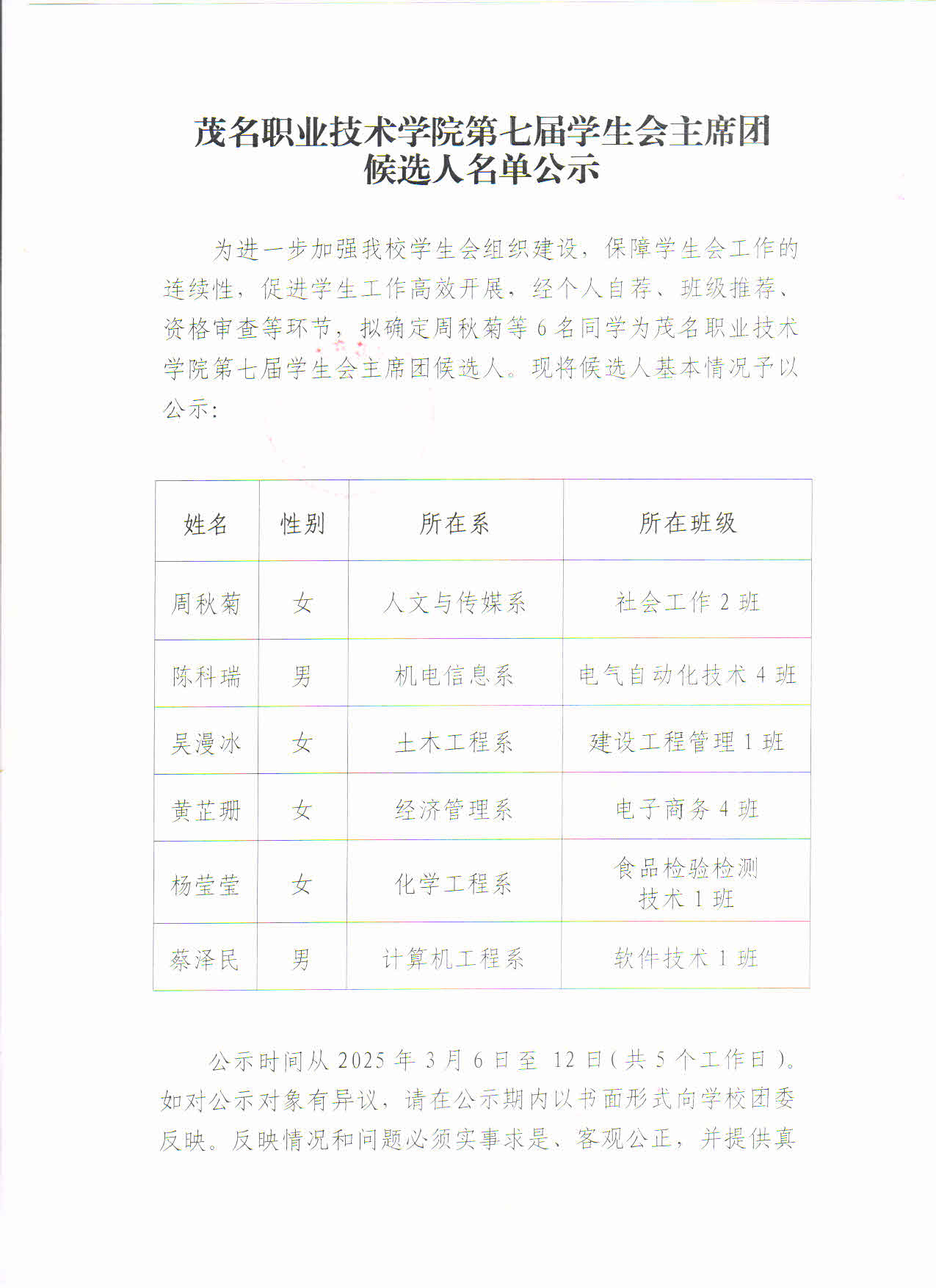 茂名职业技术学院第七届学生会主席团候选人名单公示