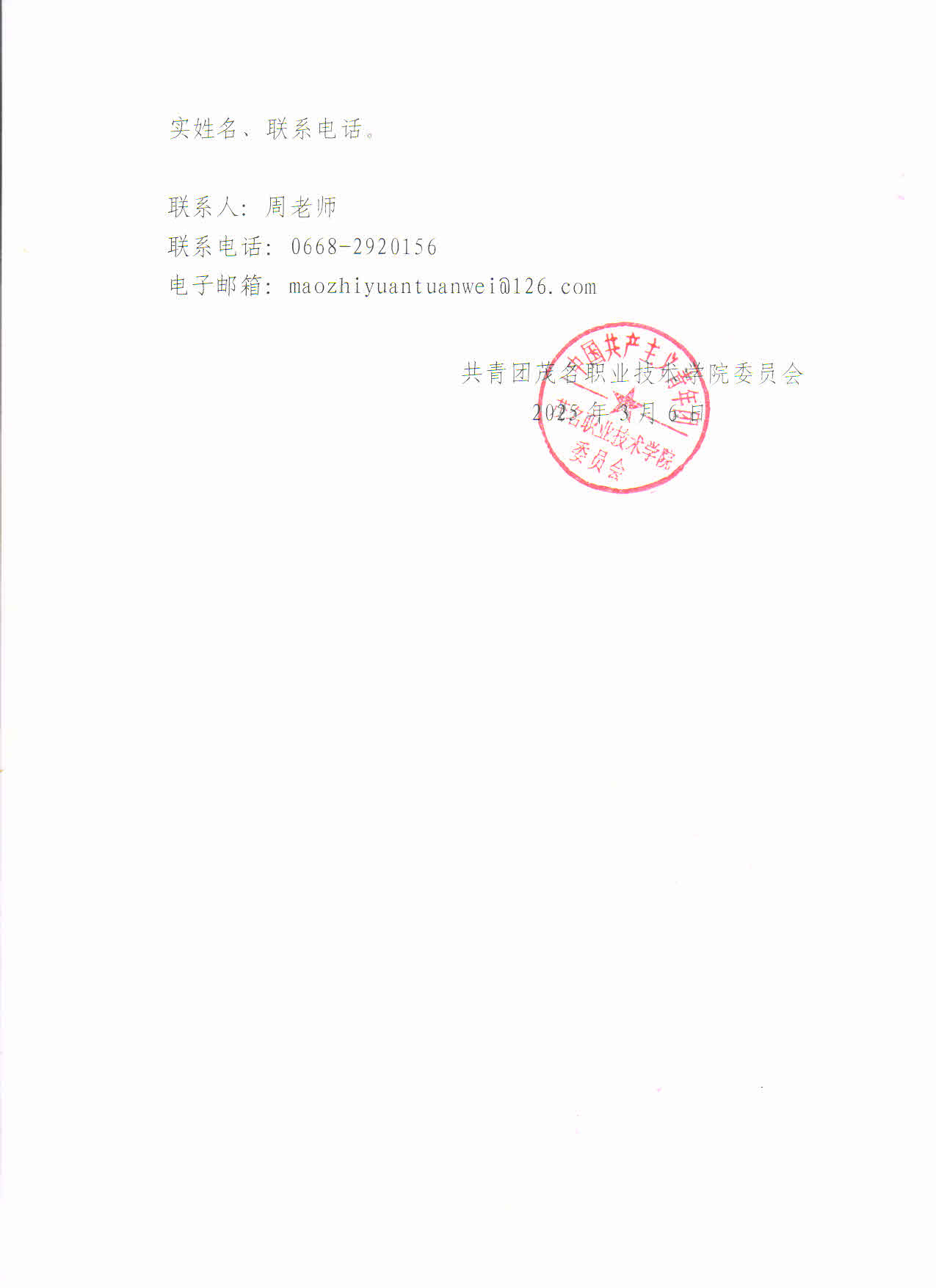 联系电话:0668-2920156 联系邮箱:maozhiyuantuanwei@126.com