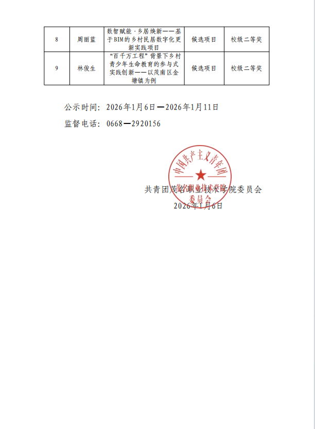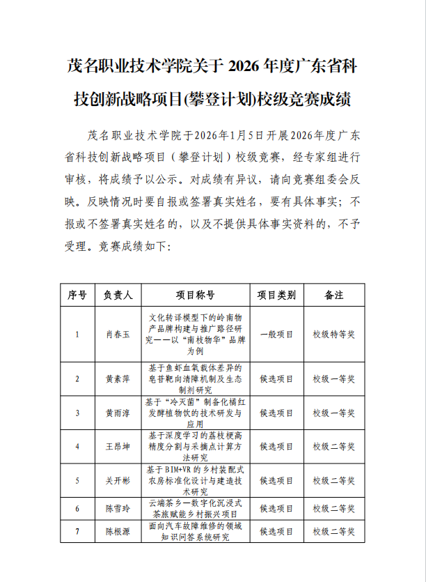 茂名职业技术学院关于2026年度广东省科技创新战略项目(攀登计划)校级竞赛成绩公示