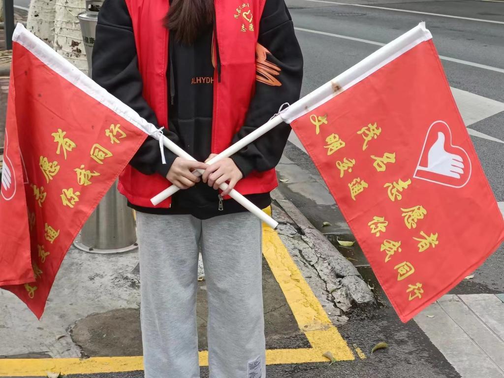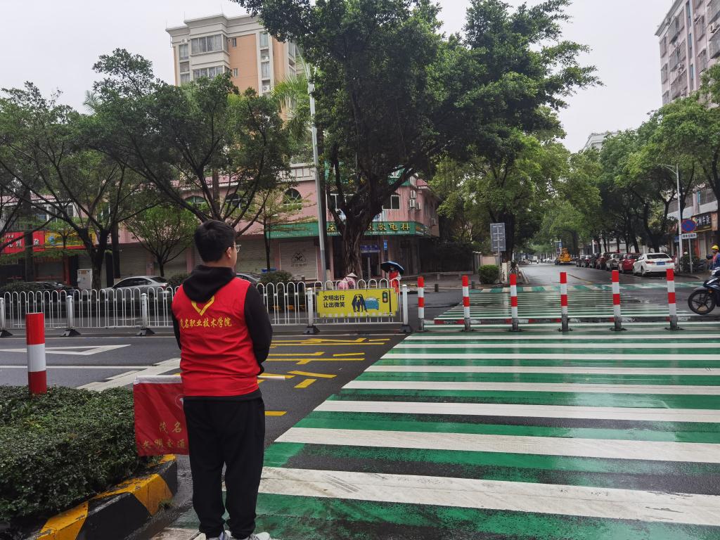 活动前期,茂名职业技术学院组织志愿者们参与2023年茂名市“创文巩卫青年先锋”学雷锋志愿服务行动,联合交警部门在校园里开展文明交通志愿者培训班。在创文期间,茂名职业技术学院创文志愿者们冒着阴雨连绵的天气奋战在最前线。志愿者们统一身穿红马褂,手执文明交通牌,引导司机礼让行人,劝导行人遵守交通规则,倡导文明出行、安全出行,带动群众积极响应文明礼让行为,共同为茂名市创建文明城市献一份力,得到了广大市民的认可和赞许。