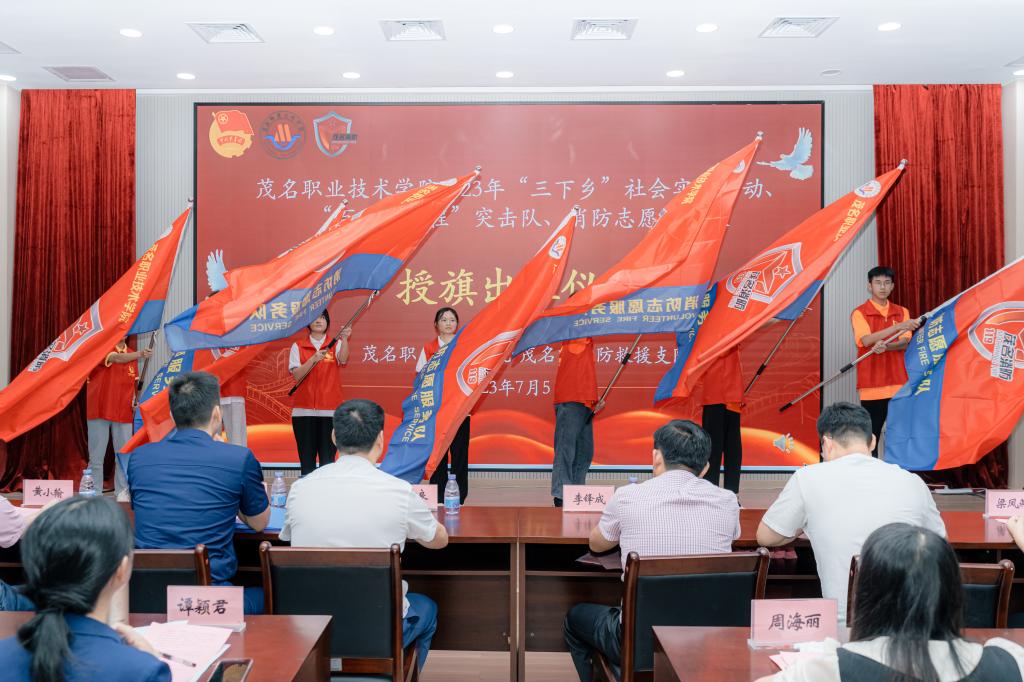 与会领导为茂名职业技术学院入围“推普助力乡村振兴”全国大学生暑期社会实践志愿服务队、广东省“百千万工程”突击队的志愿服务队、茂名职业技术学院“百千万工程”突击队、茂名职业技术学院消防志愿服务队的代表进行授旗。茂名职业技术学院消防志愿服务队接过旗帜,标志着茂名首支高校消防志愿服务队在茂名职业技术学院正式成立。