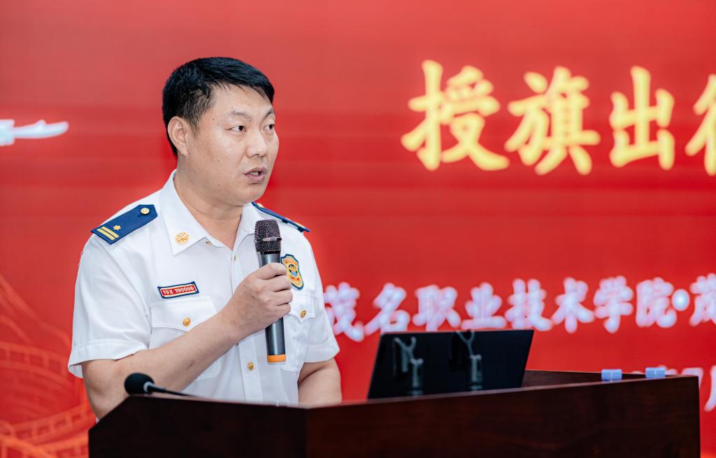 马智良发言。他代表茂名市消防救援支队向关心支持消防工作和消防公益事业的学校师生、志愿者们表示感谢!他希望茂名职业技术学院消防志愿服务队充分发挥大学生的志愿服务精神,广泛动员身边同学积极参与消防志愿服务事业,努力成为火灾隐患的发现者、消防知识的传播者、守卫安全的实践者,深入农村、社区等地区广泛开展消防宣传服务,全力打通消防宣传“最后一公里”,更好地发挥大学生志愿者在消防基层治理中的积极作用。