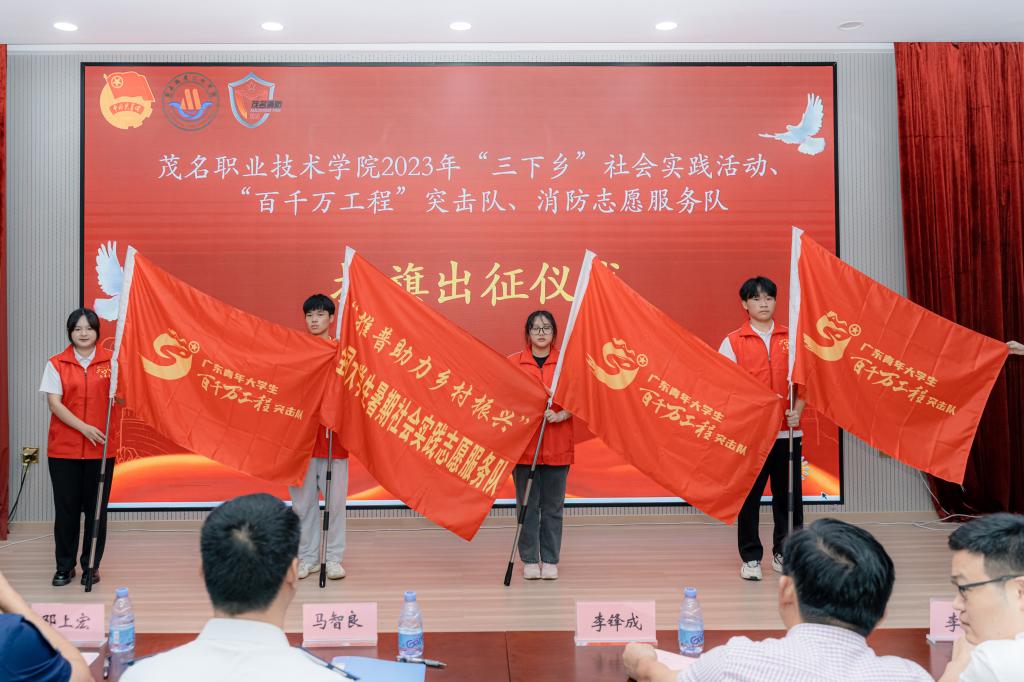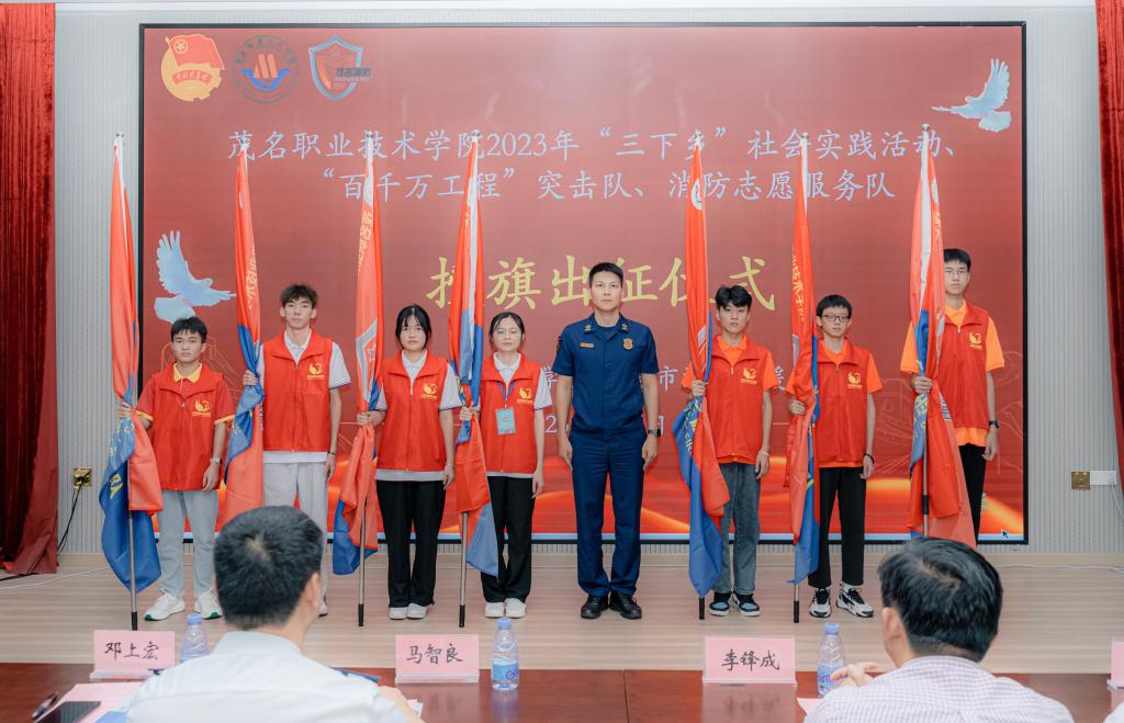 此次活动标志着,茂名职业技术学院2023年社会实践志愿服务队、“百千万工程”突击队、消防志愿服务队正式出征了。2023年茂名职业技术学院组织了5位专家教授带领多支荣获第十七届“挑战杯”广东大学生课外学术科技作品竞赛奖项的大学生志愿者队伍赴高州市根子镇、曹江镇、信宜市镇隆镇、大成镇、池洞镇、化州市笪桥镇、电白区沙院镇开展暑期文化科技卫生“三下乡”社会实践活动。其中,1支队伍入选2023年“推普助力乡村振兴”全国大学生暑期社会实践志愿服务活动项目,“紧跟总书记复兴脚步,高校新媒体助力振兴”、“‘成’邀你来-打造生态旅游综合体,助力乡村振兴”、“地空联合的智能采摘机器人助力荔枝等水果产业高质量发展”等3支队伍项目入选广东青年大学生“百千万工程”突击队结对成功行动项目。